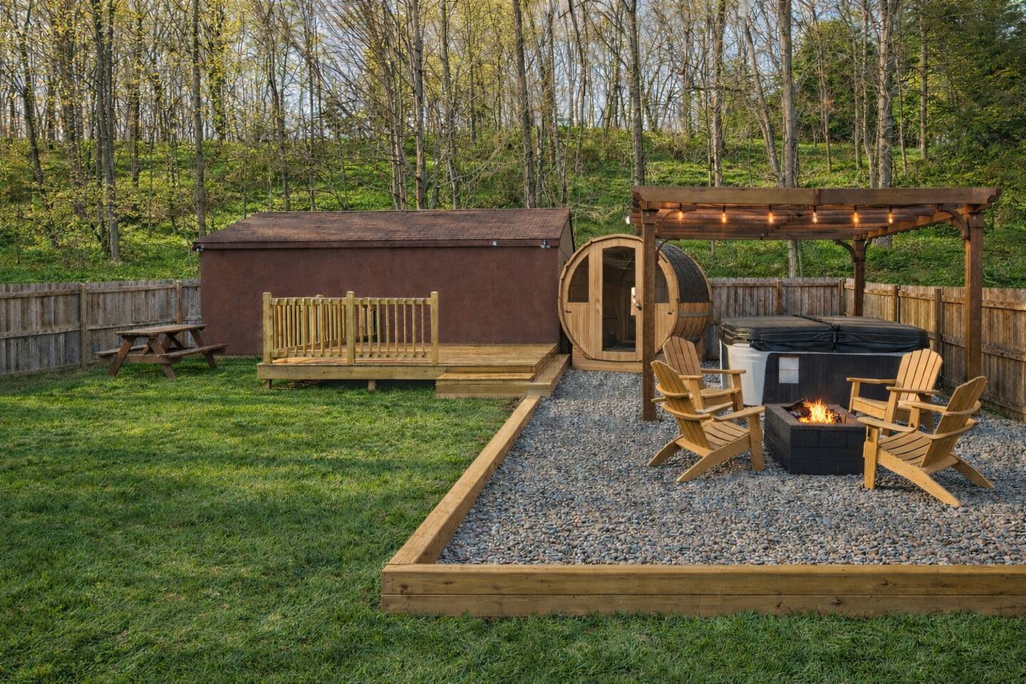 Welcome to a cozy and inviting retreat designed for unforgettable girls’ or couples getaways. This thoughtfully set up home offers comfort, flexibility, and relaxing spa-style amenities, so your group can truly unwind without ever feeling rushed. This newly renovated 3-bedroom, 1-bath home features flexible sleeping arrangements, open shared spaces, and an outdoor spa experience that makes every stay feel special, whether you’re here for quality family time or a relaxing getaway with friends. Enjoy our: - Barrel Sauna - Hot tub - Yoga Deck area - Fire pit Book your health and wellness spa getaway today! ------------------------------------- 🛏️ Sleeping Setup • Bedroom 1 features a comfortable queen bed and a 32” Roku Smart TV. • Bedroom 2 offers two twin beds along with a 32” Roku Smart TV. • Bedroom 3 includes a twin trundle bed with a pull-out twin and a 24” Roku Smart TV. • The living room has a queen pull-out sofa, a 48” Smart TV, and cozy seating perfect for movie nights and relaxing downtime. ------------------------------------- Dining & Kitchen Seating • Wrap-around dining bench with two chairs, perfect for meals, board games, or late-night chats • Breakfast bar with two stools for morning coffee, snacks, or wine nights. ------------------------------------- Outdoor Spa Experience • Six-person hot tub • Barrel sauna • Fire pit area (set up in March/April Weather Dependant) Perfect for slow mornings, post-adventure recovery, or cozy late-night conversations under the stars. ------------------------------------- Perfect for Families • Smart TVs in every bedroom • Separate sleeping spaces for kids and adults • Easy, functional layout that keeps everyone connected without feeling crowded ------------------------------------- Perfect for Girls’ Getaways • Spa-like vibes without the spa price • Perfect for Finger Lakes Bachelorette trips • Hot tub, sauna, and fire pit for bonding time • Ideal flow for wine nights, bachelorette gatherings, and relaxed mornings ------------------------------------- Location Nestled in the quiet village of Marcellus, just outside Syracuse, this home offers a peaceful setting with quick access to dining, shopping, and events, including Syracuse University and the JMA Wireless Dome. Close to your favorite Finger Lakes! Skaneateles Lake, Otisco Lake and Owasco Lake are a short drive from this cozy home! ------------------------------------- Top Things To Do Nearby Beak & Skiff Apple Orchards – Cider tastings, stunning views, and seasonal events Finger Lakes Wine Trails – Award-winning wineries and charming lake towns Green Lakes State Park – Scenic hiking, swimming, and unforgettable turquoise lakes Downtown Syracuse – Shopping, museums, dining, and entertainment Skaneateles Lake – Walk the pier, boat rentals, boutiques, and lakeside dining ------------------------------------- Top Local Restaurants Guests Love The Krebs – Historic German-American cuisine in Skaneateles Gilda’s – Upscale Italian with great wine and cocktails The Sherwood Inn – Lakeside dining with classic American favorites Elderberry Pond Restaurant – Farm-to-table dining with a cozy, refined atmosphere XO Taco – Fun, flavorful tacos and margaritas in downtown Syracuse ------------------------------------- Location Features • Quiet village setting in Marcellus, offering a peaceful and residential atmosphere • Close to lakes and beaches, short drives to nearby lakes, swimming areas, and waterfront spots • Easy access to outdoor recreation including hiking, fishing, and scenic nature areas • Laundromat nearby for added convenience during longer stays • Private entrance for guest use • Short drive to Syracuse for dining, shopping, events, and Syracuse University ------------------------------------- Why Guests Love This Home • Comfortable beds and thoughtful touches • Plenty of space to spread out and relax • Spa amenities right on-site • Quiet setting with easy access to everything This is the kind of stay where everyone sleeps well, slows down, and leaves feeling refreshed, reconnected, and already planning their next visit💛