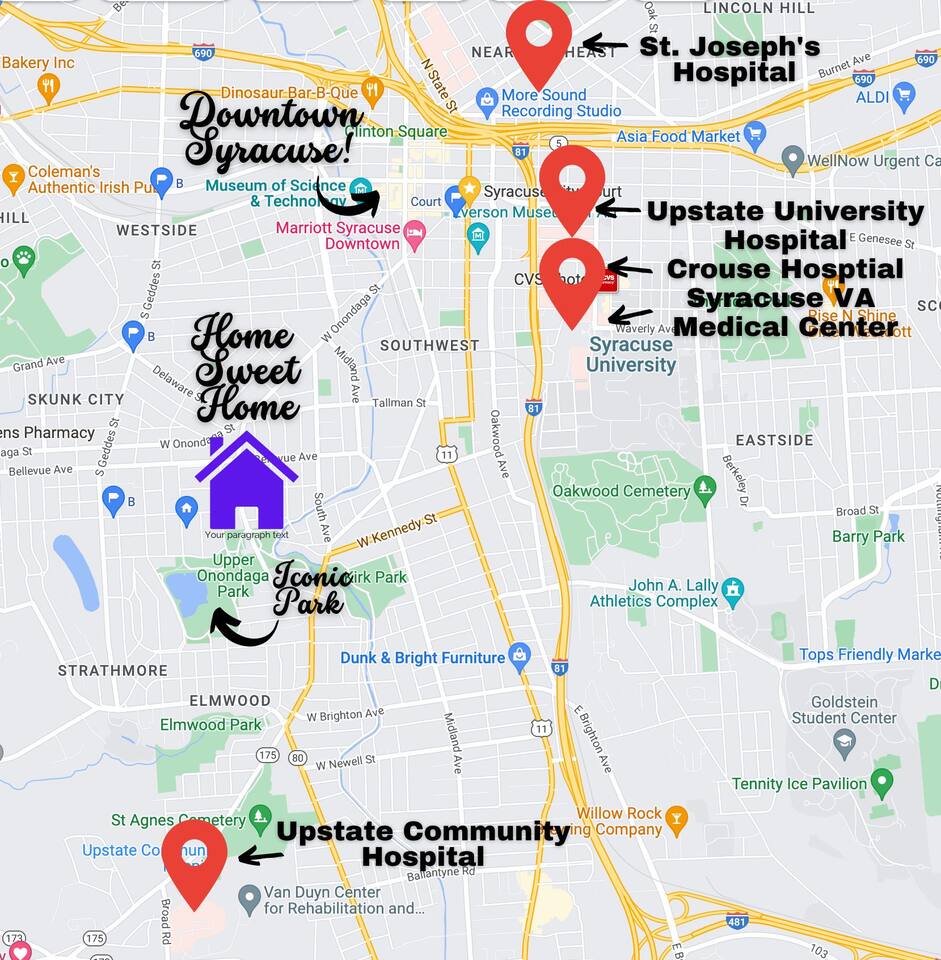 Getting Around β Quick & Easy Access to Key Locations π Downtown & Armory Square: Head north on Onondaga Ave to reach Armory Square, where you'll find a variety of top-rated restaurants, bars, and entertainment options. π₯ Hospitals & Syracuse University: To reach Syracuse University, Upstate University Hospital, St. Josephβs Hospital, and Crouse Hospital, drive north on Onondaga Ave and take a right on Brighton St. For Upstate Community Hospital, drive south on Onondaga Ave, then turn right on South Ave. Drive up the hill, and Upstate Community Hospital will be on your left. π« Onondaga Community College (OCC): Continue past Upstate Community Hospital to the intersection of South Ave and Seneca Turnpike. Turn right onto Seneca Turnpike, drive a few miles, and youβll see OCC on your right. π£ Access to Highways & Suburbs: To quickly reach the suburbs via I-690, drive north on Onondaga Ave, turn left on West St., and continue straight to the I-690 West and East ramps. π Enjoy a central location with easy access to hospitals, universities, and major highways!
