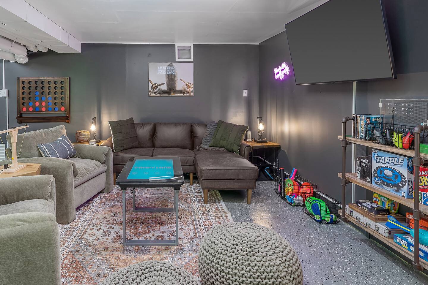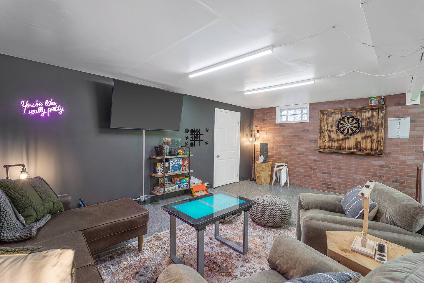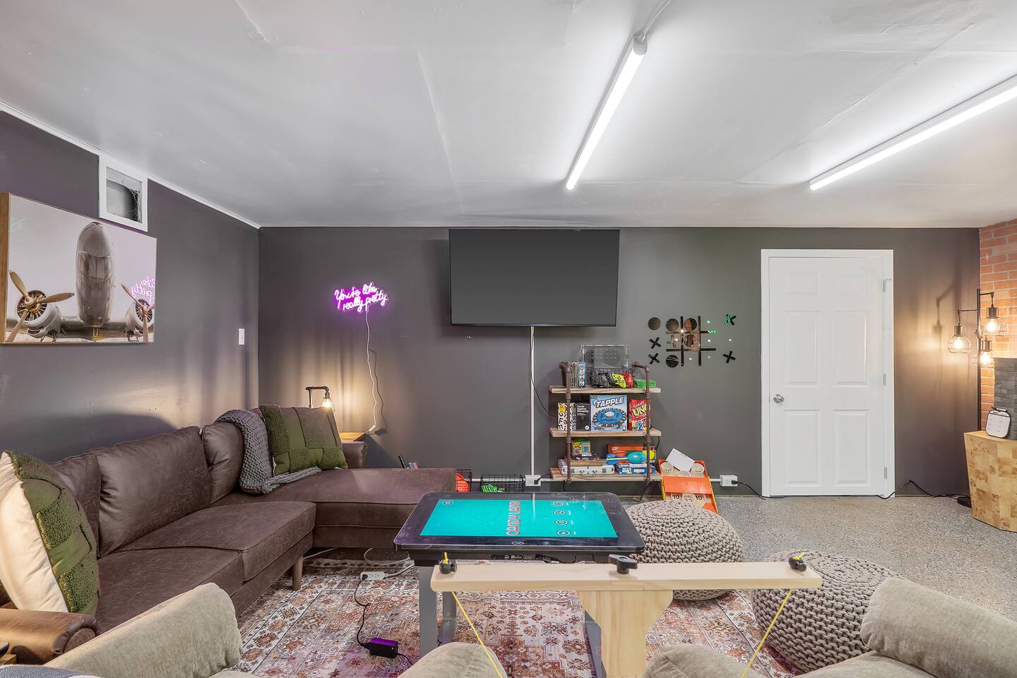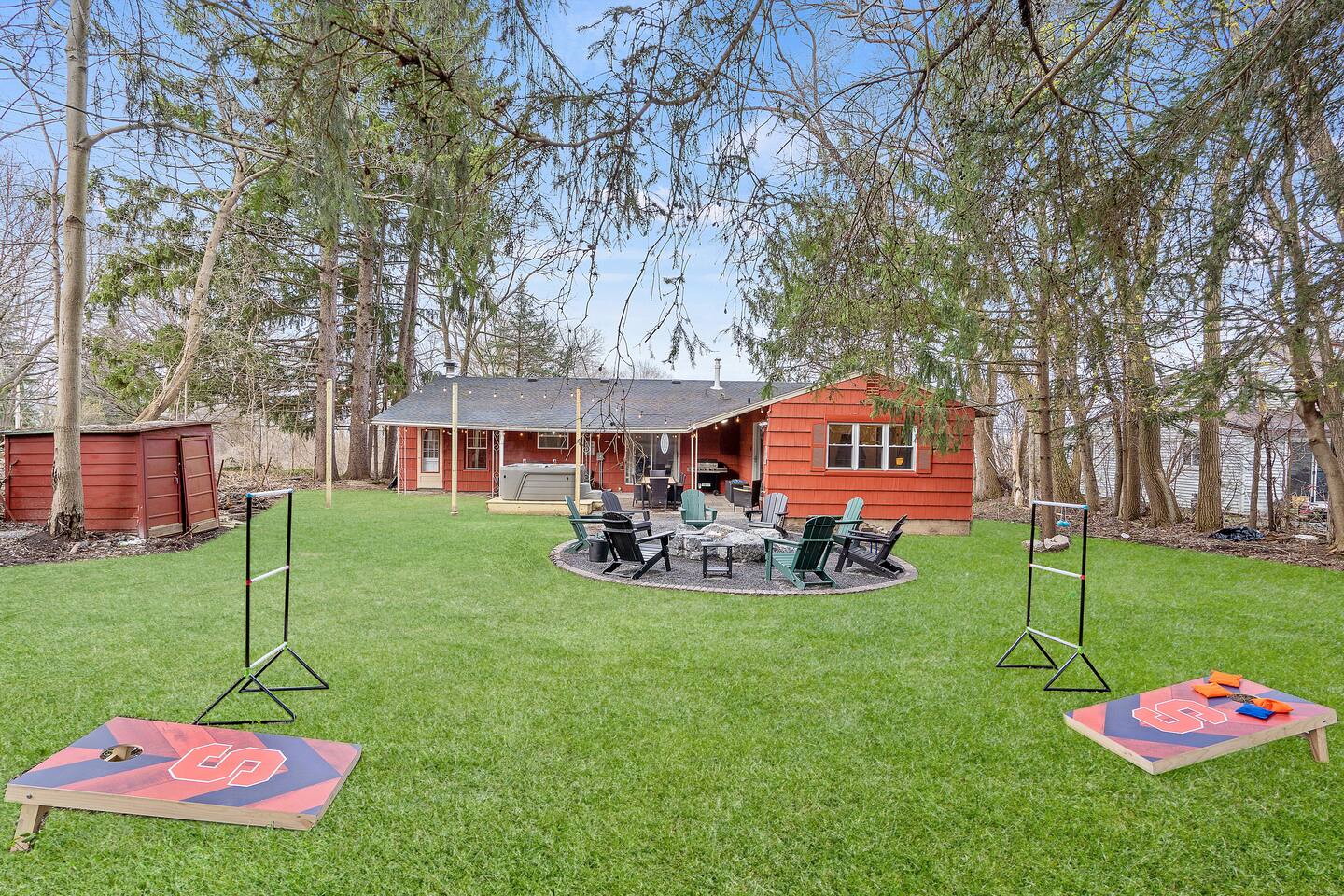 Welcome to this enchanting home, adorned with elegant details, plush furnishings, and, above all, an unparalleled experience. Inside, you'll find a comfy living room with a smart TV, a full dining room, and a well-equipped kitchen. Enjoy some fun in the fully equipped game room, and rest in well-furnished bedrooms that also have smart TVs. Master suite: King bed Room 2: Queen Bed Room 3: Queen Bed Basement room: Two Queen Beds and pack n play One Large Couch Game room features: - Table Tennis/Ping Pong - Foosball table - Arcade Board Game Table with 100+ free games - Large smart TV - Xbox One game consoles with four remotes and a handful of games (feel free to bring more) - Regulation Darts - Ring and Hook game - Giant Jenga blocks - Loads of board games (card against humanities, poker set, Giant UNO) - Selfie Wall - and more! Outside, our carefully designed space offers a paver patio with a dining set for outdoor gatherings. Relax in the six-person hot tub or gather around the fire pit for a cozy evening. Whether indoors or outdoors, this home is crafted for your comfort and enjoyment. Outdoor activities include: Corn hole set with LED lights, Ladder Ball set, Horseshoes, hot tub, 8 person dining set, 8 person firepit circle, new Propane grill, all under the ambience of some cafe string lights. This home isn't just a retreat; it's an ideal haven for your visit. Conveniently located just a few minutes' drive from downtown Syracuse, Syracuse University, Upstate Hospital, St. Joseph's Hospital, and Crouse Hospital, accessibility to key destinations is at your fingertips. But that's not all – a short drive will take you to the picturesque town of Skaneateles in idyllic Upstate New York. Here, you can revel in the charm of one of the best Finger Lakes waterfront areas and indulge in boutique aesthetics, completing your experience with a touch of small-town charm. Your time here promises not just comfort but also a seamless blend of urban convenience and the tranquility of Upstate's scenic beauty. The home features a comfortable living room with smart TV, a full dining room with seating area, full kitchen, arcade and game room and well appointed bedrooms. Not only that, but you will be sure to enjoy our outdoor space, featuring paver patio, dining set, 6 person hot tub and fire pit. Our driveway can comfortably accommodate up to 4-5 vehicles.
