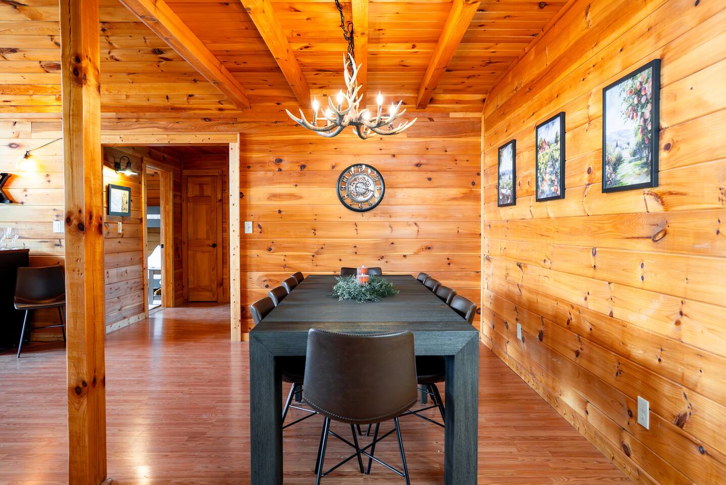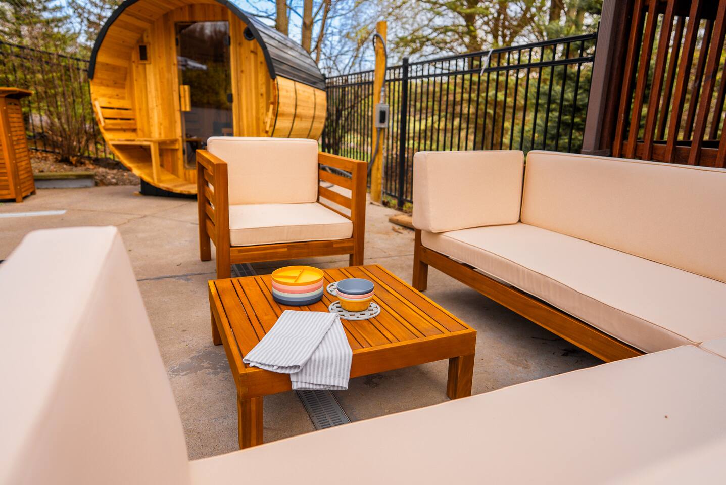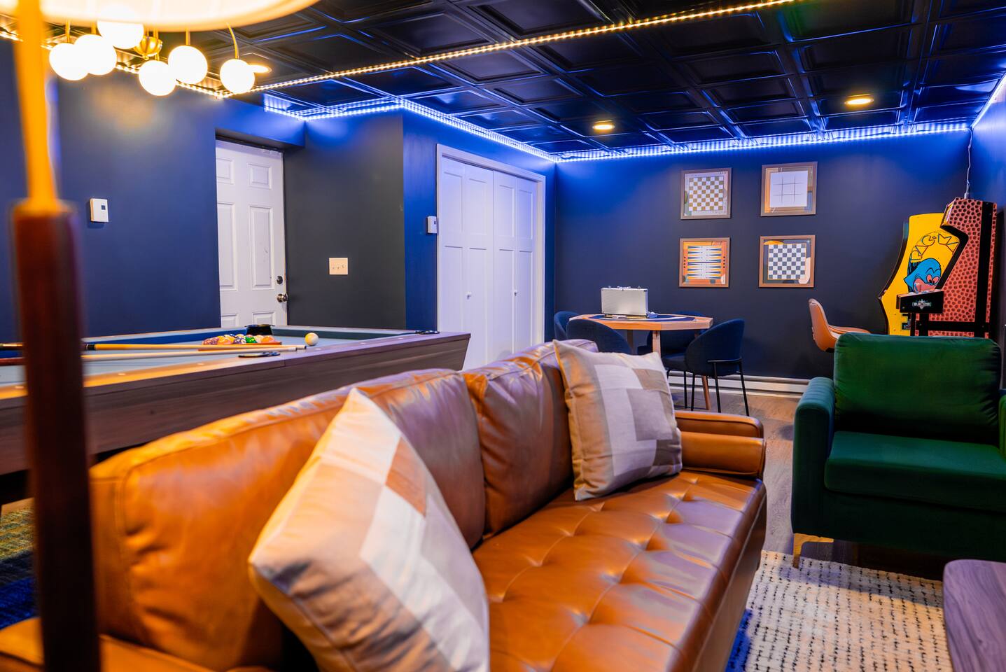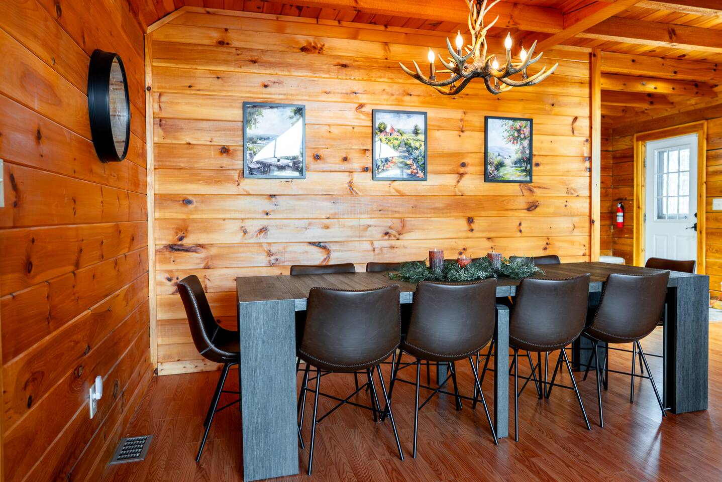 Some trips are about going hard. Some are about finally slowing down. Gateway FLX is built for both. Sometimes in the same afternoon. The front porch faces southwest across an open valley. It's the kind of view that makes people put their phones down. The back deck has a heated pool, hot tub, and fire pit. There's a barrel sauna. A full game room. Five acres with a forest trail out back. And the entire Finger Lakes within 30 minutes. If you're the one who booked this trip, your group will thank you. Sleep Five bedrooms sleep up to 15: Primary Suite (upstairs, ensuite): King Bedroom 2 (upstairs): Queen + Twin XL bunk Bedroom 3 (downstairs): King, King Bedroom 4 (downstairs): Queen Bedroom 5 (downstairs): Queen Common area (downstairs): Queen pullout sleeper sofa Every bedroom has a noise-canceling alarm clock with Bluetooth speaker, wireless charging, and USB charging. Unwind Heated pool (May through Sept/October), hot tub, barrel sauna, two fire pits (propane on the front porch, wood out back), four propane heaters, front porch outdoor dining and lounge seating overlooking the valley, and a 5-burner propane grill on the back deck. Play Game room: pool table (converts to ping pong), two arcade games, poker table, dartboard, and Xbox with Game Pass on a large-screen TV. Living room: 75" smart TV and record player. Four Bluetooth boomboxes around the property. Outside: volleyball, cornhole, basketball, soccer, and a hikeable forest trail on the property. Tech and Comfort Verizon FiOS WiFi, central A/C, Ecobee smart thermostats, whole-home water filtration, streaming on every TV (Disney+, Hulu, ESPN+), gas washer/dryer, countertop ice maker, Level 2 EV charger (Tesla + non-Tesla).