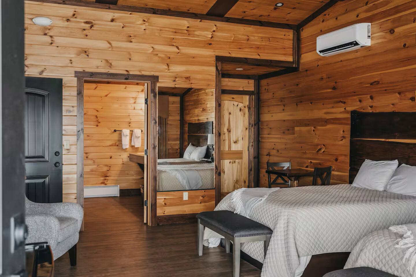 Escape to this cozy cabin in Tully, NY. Whether you're skiing, hiking, or just unwinding, this cozy boutique hotel suite cabin provides hotel-style comfort, and a relaxing atmosphere. Minutes from Song & Labrador Mountain and Syracuse. Book your perfect getaway now! Each unit includes a suite with a large bathroom, walk-in shower, desk, mini-fridge, and coffee maker. Suite 7 can optionally connect with suite 8 via a communicating door, that locks from both sides.